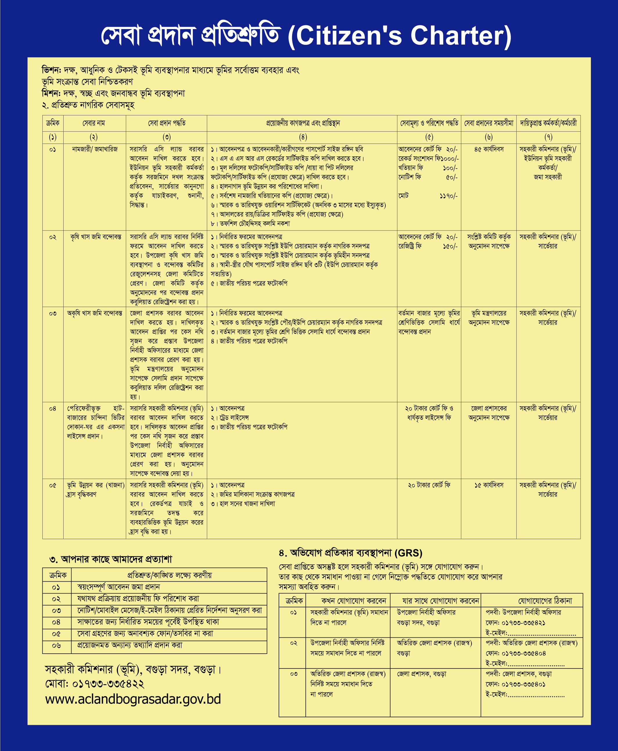 | ০৯ | জমির পরচা, খতিয়ান, নকশা ও আবাসন ও আশ্রয়ন প্রকল্প ইত্যাদি সংক্রান্ত তথ্য | ০১ হইতে ০৭ দিন | কানুনগো/সার্ভেয়ার | সহকারী কমিশনার (ভূমি) বগুড়া সদর |